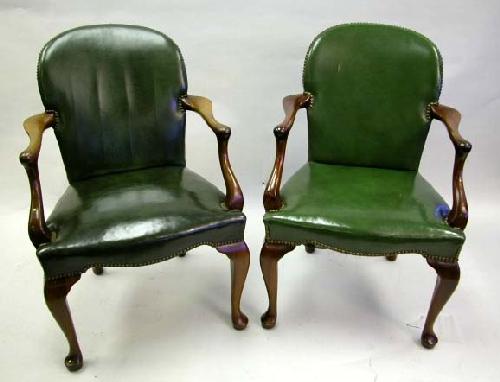 A SET OF FOUR GEORGE I STYLE LEATHER-UPHOLSTERED MAHOGANY OPEN ARMCHAIRS; In the English tradition, with arched crest, shaped arms and cabriole legs