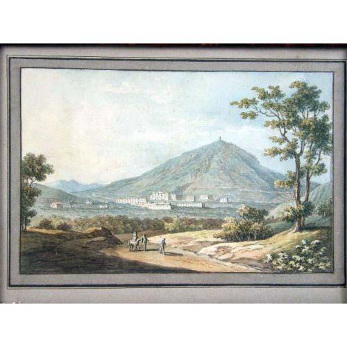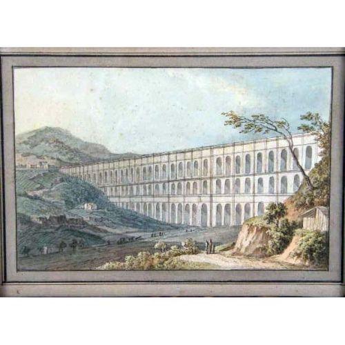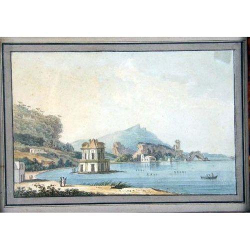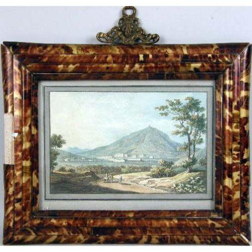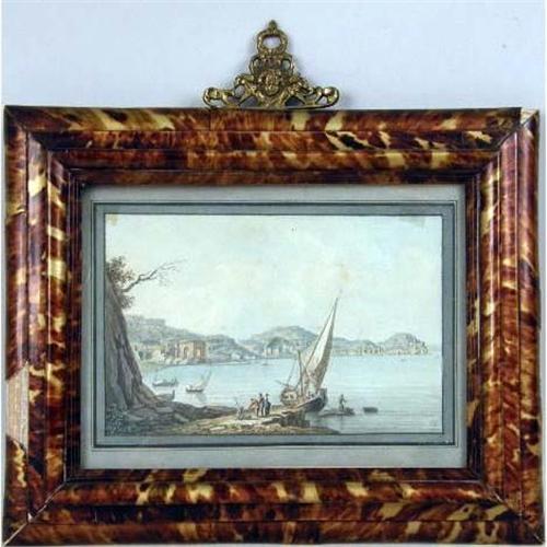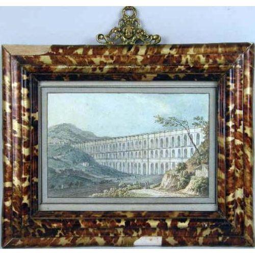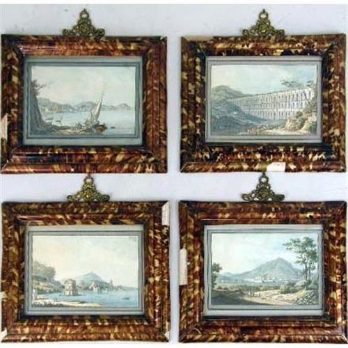 A SET OF FOUR NEAPOLITAN SCHOOL FRAMED WATERCOLORS<BR><BR>Including views of the Bay of Naples with Mt. Vesuvius in the background, and a Roman aqueduct, each matted in framed in a tortoise-shell form, some losses. each image 5" x 8"