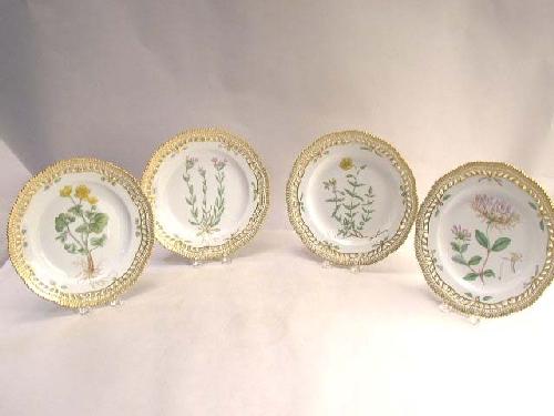 A SET OF FOUR ROYAL COPENHAGEN "FLORA DANICA" PATTERN PORCELAIN LUNCHEON PLATES; With gilt serrated and beaded reticulated scalloped rim border, each central painted with specimen flowers, blue waves and green printed marks, #3553, 10"dia.