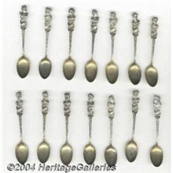 <B>A SET OF FOURTEEN SILVER PERSONALITY SOUVENIR SPOONS</B></I><BR>Mark of Gorham, Providence, Rhode Island, c.1900<BR><BR>Set of fourteen figural personality theme spoons, bust of assorted characters at terminal of handle, gold wash bowl, <I>marked sterling reverse of handles</B></I><BR>each 4.25in. long 14 Items <BR><BR><B>Important notice:</B> Heritage usually auctions material at the rate of 200-250 lots per hour. On some occasions eBay Live bid software or the Internet may not be able to keep up with the pace of the auction. We recommend placing a realistic absentee bid now as insurance to avoid disappointment. Occasionally the auctioneer may eliminate or reject an eBay Live bid, and the auctioneer may also reopen a lot after the close of the eBay live bidding (usually because we missed an audience bid), and may reject your bid even if it shows you as the winning bidder. By bidding via eBay Live, you agree that Heritage may award the lot to another bidder at its sole discretion under the circumstances described above or any other reasonable circumstances. Since eBay bids are not shown to us until we open the lot on the floor, we treat those bids just like floor bids. In most cases the floor responds before the eBay bid is presented to us, due to Internet lag time, so for consistency we have made it a policy that floor bids are always considered first over tie eBay live bids. Also please note that all Heritage lots purchased through eBay Live carry a 25% Buyer's Premium. Please make sure you read the Terms and Conditions before you bid. <BR><BR><B>IMPORTANT ANNOUNCEMENT ABOUT RESERVES:</B> Heritage now divulges all reserves on its web site 7 days before every auction. If you want to know whether the reserve on this lot has been met, and if not, what the reserve amount is, please visit this lot page on the HeritageCoin.com web site, or email: bid@HeritageGalleries.com </span></font>