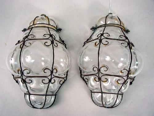 A SET OF FROSTED GLASS WALL SCONCE SHADES; Each with wire strapwork, together with a colorless pair of sconces and matching ceiling fixture, losses,
