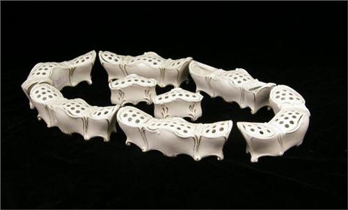 Consisting of six vases and four holders. Together with a similar cherub-and-shell-form dish, and four square white porcelain candlesticks, and eight white porcelain flower holders of assorted sizes, All but one with gilt-painted accents, all marked with the crowned "N" of the Rudolstadt Fabrik, Saxony. With two extra flower stem "screens". 23 pieces. Vases 6"h, menu holders 5 1/2"h, flower holders from 4"l to 8 3/4"l The menu holders with breaks and losses to each.