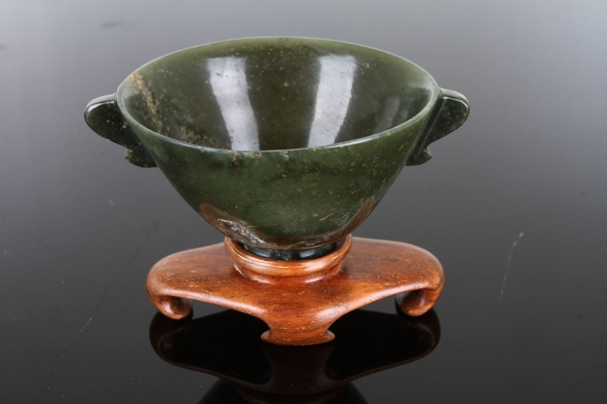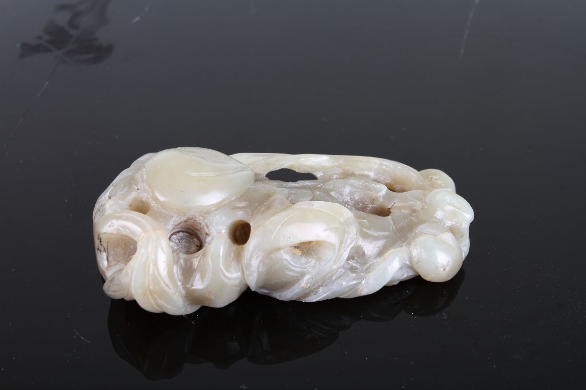 A SET OF JADE CARVED CUP WITH HANDLE AND PENDNAT WITH PEACHES (2 ITEMS)(MEASURED WITH THE LARGEST ITEM) W:3.5" H:2"碧玉制耳杯及玉质灵猴献寿把件组