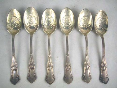 A SET OF SIX ANTIQUE STERLING SILVER TEASPOONS, vermeil bowls