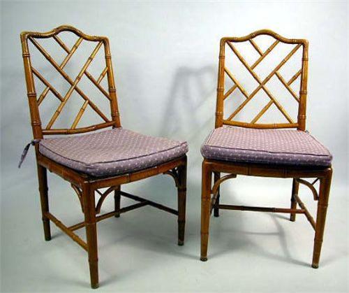 A SET OF SIX GEORGE III STYLE COCK-PEN SIDE CHAIRS; With serpentine crests, faux bamboo turnings, a caned seat above tapering legs joined by stretchers, (some wear and imperfections to surface) 36 1/2"h