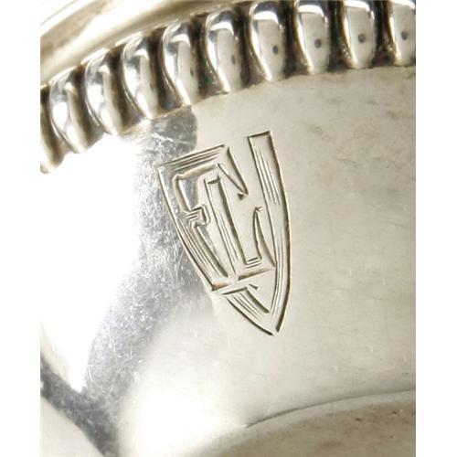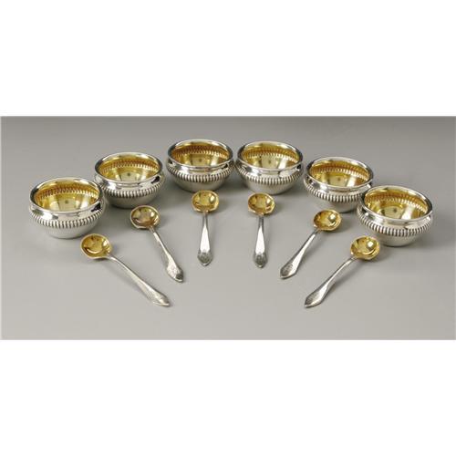 <B>A Set Of Six Sterling Salts With Spoons</B></I><BR>Gorham, Providence, RI, Nineteenth Century<BR><BR>A set of six sterling individual salts with flared mouth and beaded shoulder, gilt interior, together with six spoons by the Durgin Division of Gorham, maker's hallmark to underside, engraved 'FLJ' in shield.<BR>12 <BR><BR><B>Condition Report:</B> Normal signs of wear with age