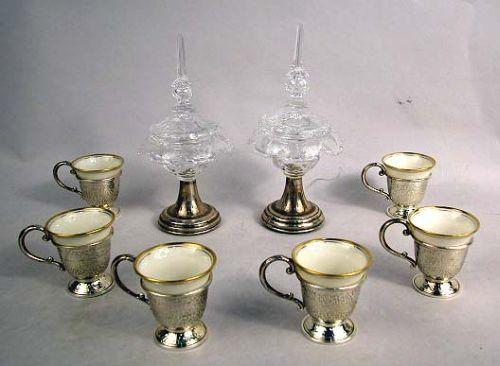 A SET OF SIX GREEN MARK LENOX DEMITASSE CUPS AND STERLING SILVER LINERS; Together with a pair of colorless glass sterling silver covered jars