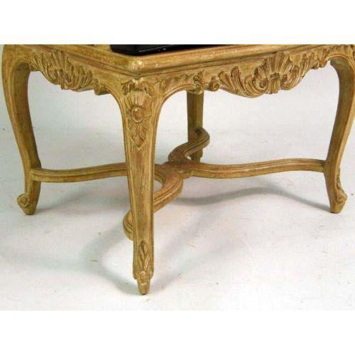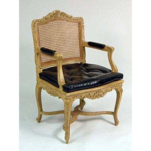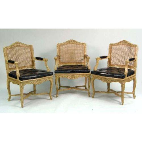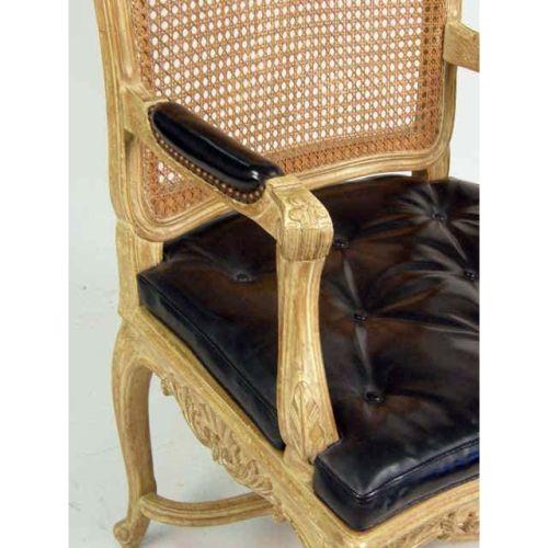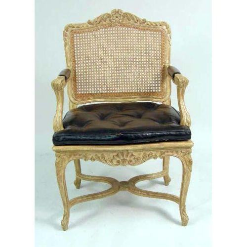 A SET OF SIX LOUIS XV STYLE PICKLED BEECHWOOD CANED FAUTEUILS<BR><BR>Each with caned back and seat, carved frame, black leather loose seat cushion and cabriole legs