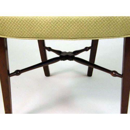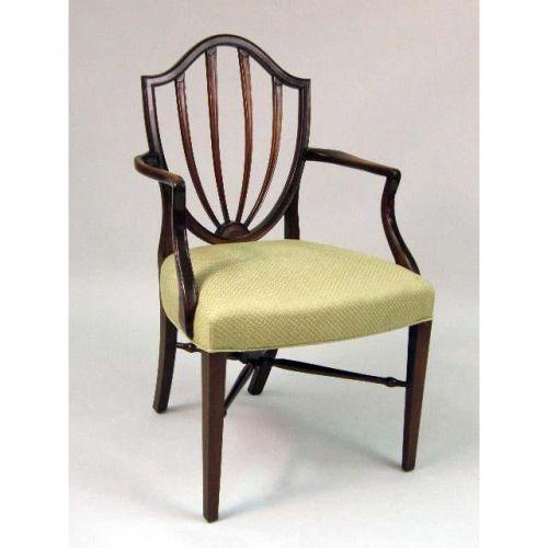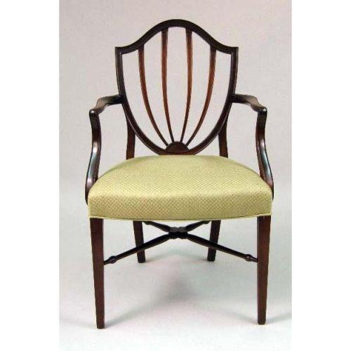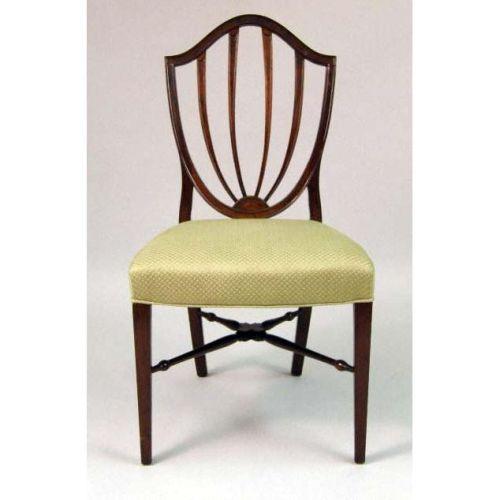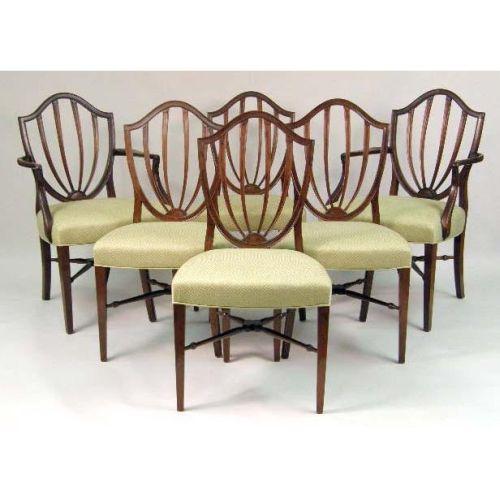 A SET OF SIX MATCHED HEPPLEWHITE-STYLE SHIELD-BACK CHAIRS<BR><BR>consisting of two arm- and four side-chairs. Each 37 1/2" h x 24" w x 19 1/2" d.