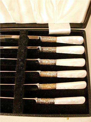 Stamped Eales of Sheffield Since 1779. Knives 6 3/4"l. Together with a set of six mother-of-pearl handled fruit knives in presentation box.