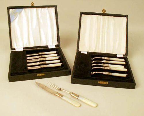 In presentation boxes, one stamped on ribbon "Vinens, England, by appointment to the late King, George V, Cutlers and Silversmiths, Vinen, Sheffield", with three letter scroll monogram. Knives 6 1/8"l.