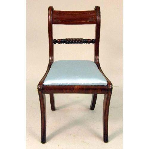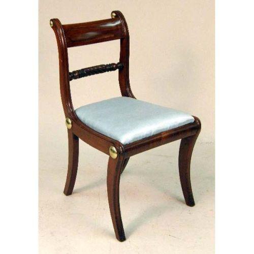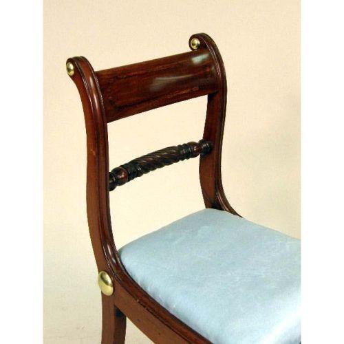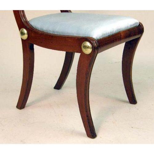 A SET OF SIX REGENCY CARVED AND INLAID WOOD SIDE CHAIRS<BR><BR>With decorative metal accents and saber legs, 32"h