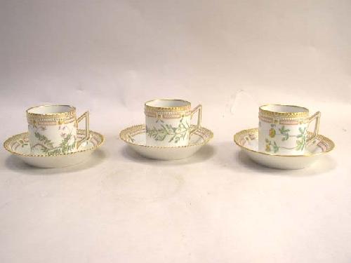A SET OF SIX ROYAL COPENHAGEN "FLORA DANICA" PATTERN PORCELAIN COFFEE CUPS WITH SAUCERS; With gilt beaded border, each painted with specimen flowers, blue waves and green printed mark, #3512, 2-1/2"high cup