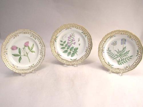 A SET OF SIX ROYAL COPENHAGEN "FLORA DANICA" PATTERN PORCELAIN DESSERT PLATES; With gilt serrated beaded reticulated scalloped rim borders, each central painted with specimen flowers, blue waves and green printed marks, pattern #3554, 9"dia.