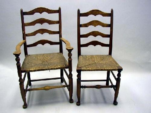 A SET OF SIX STAINED MAPLE LADDERBACK DINING CHAIRS; comprising two arm and six side chairs, each with rush seats and pad feet, some wear.