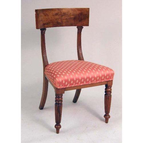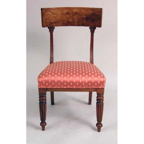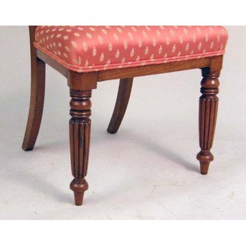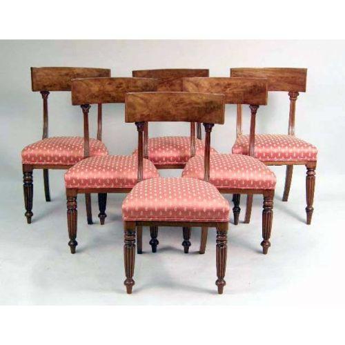 A SET OF SIX WILLIAM IV MAHOGANY DINING CHAIRS<BR><BR>Each with a dished top rail on molded uprights, the upholstered seat raised on turned tapered reeded legs