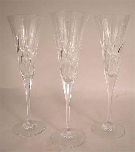 A SET OF TEN CRYSTAL CHAMPAGNE FLUTES; With swirling vessels on a faceted stem, ending on a circular foot, 9"h