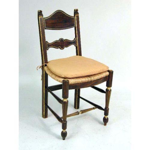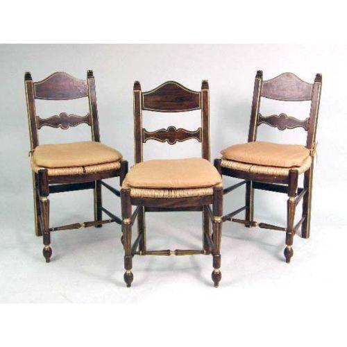 A SET OF THREE PROVINCIAL STYLE GRAIN-PAINTED AND PARCEL-GILT RUSH SEAT SIDE CHAIRS<BR><BR>In the Continental tradition, some losses to paint, 34"h