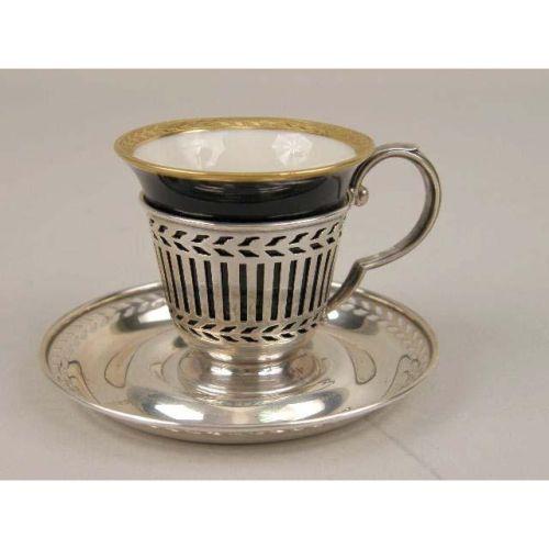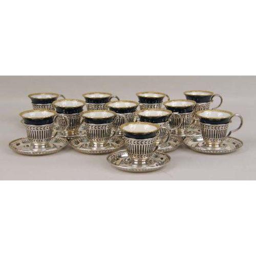 A SET OF TWELVE BAILEY, BANKS & BIDDLE STERLING SILVER DEMI-TASSE CUP HOLDERS WITH UNDERPLATES<BR><BR>With centered monogram, reticulated borders with twelve Lenox cobalt porcelain liners, total silver weight apx. 14 T.O.