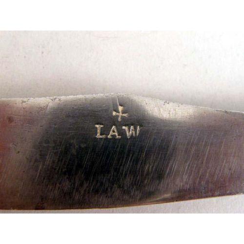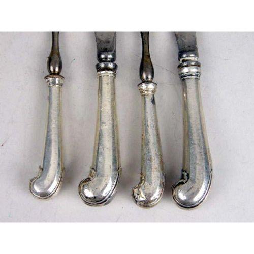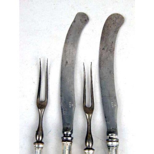 A SET OF TWELVE EARLY PISTOL HANDLED KNIVES AND FORKS<BR><BR>With silver covered wooden handles, blades marked LAW, knives 11"long, with 2 tines forks, 24 pieces, wear