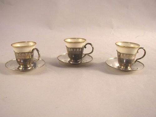 A SET OF TWELVE LENOX DEMITASSE LINERS AND STERLING SILVER HOLDERS; Lacking one liner.