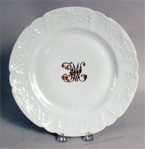 French, La Farge, white with embossed foliate scalloped border, monogrammed in gold. 11"dia.