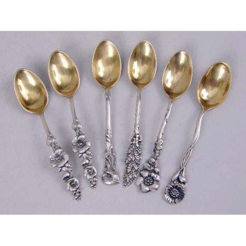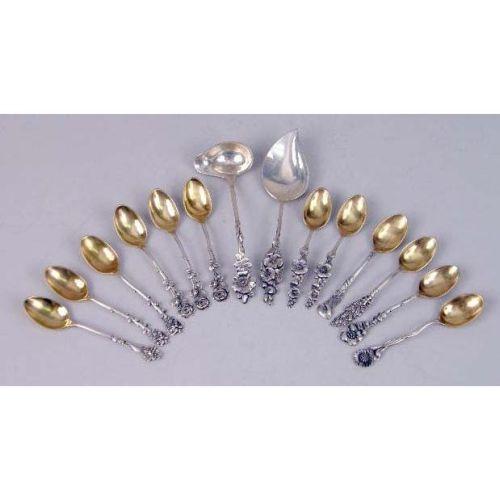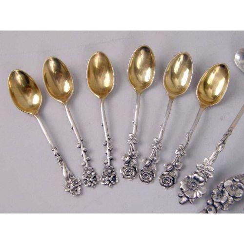 A SET OF TWELVE REED & BARTON FLORAL TERMINAL DEMI-TASSE SPOONS<BR><BR>With vermeil bowls, together with a similar jelly knife and small ladle, 5"long, total weight apx. 6 T.O.