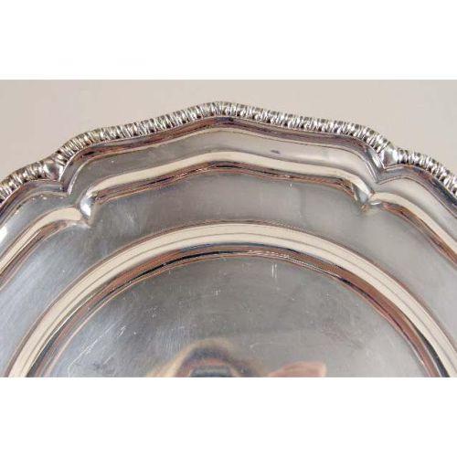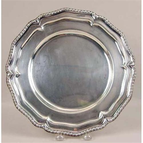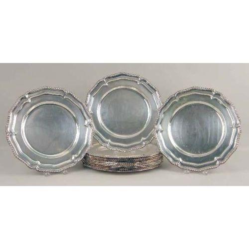 A SET OF TWELVE SILVER ON COPPER SERVICE PLATES<BR><BR>With shaped border and gadrooned edge, 11"diameter