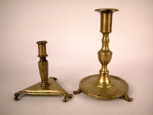 A SET OF TWO BRASS SINGLE CANDLESTICKS, SPANISH; one with triangular base, and one with round base 5"h and 7 1/2"