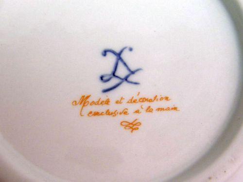 Comprising a teapot, sugar, creamer and six each cups and saucers. The bases with a Sevres mark, the larger pieces marked in French "Exclusively hand-decorated". On an etched-glass serving tray. 16 pieces. The underside of the tray with a 1/2" x 3/4" chip to one edge of glass.