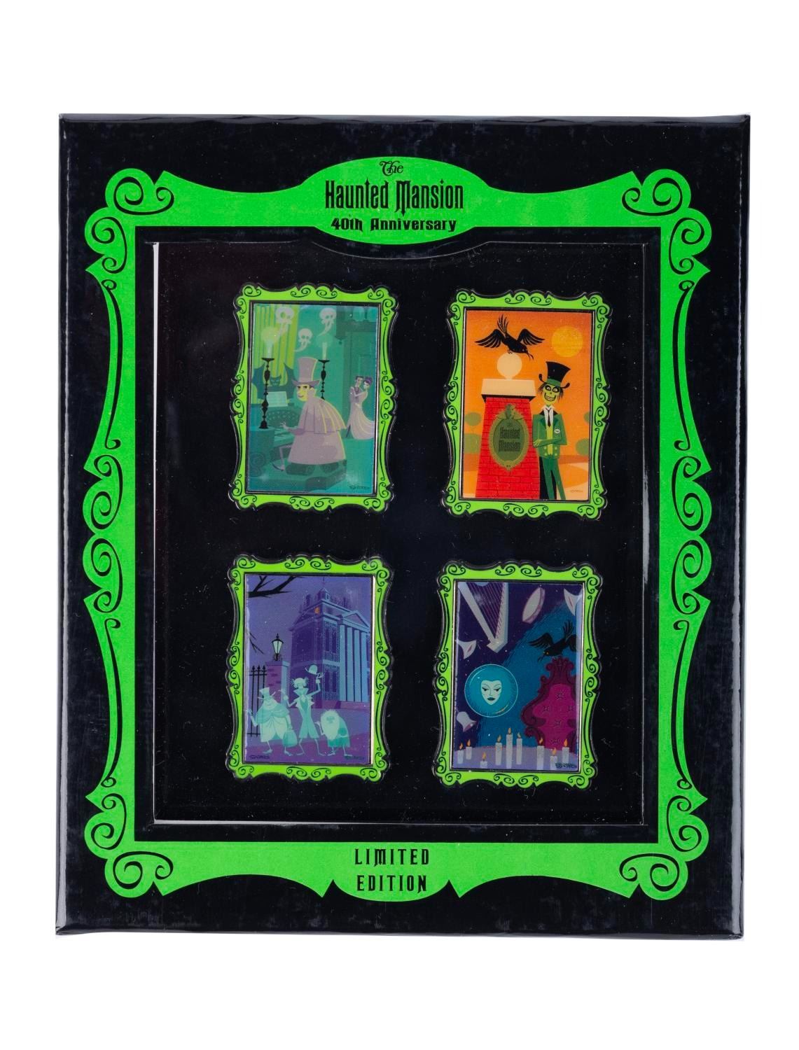 (Disneyland, 2009) A SHAG-signed Haunted Mansion Poster Pin Set. The set includes four colorful pins, each released in an edition of 250 for the 40th anniversary of the attraction. The pins are in fine condition and come within their original box, which is signed on the reverse by artist Josh "SHAG" Agle, and displays some handling wear.