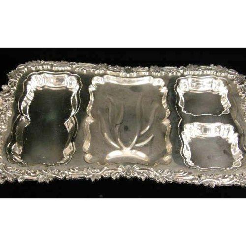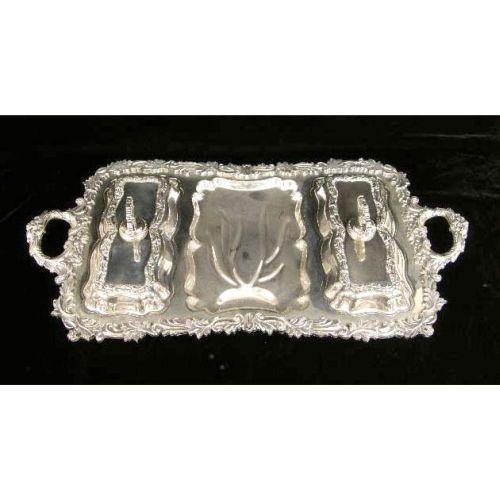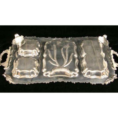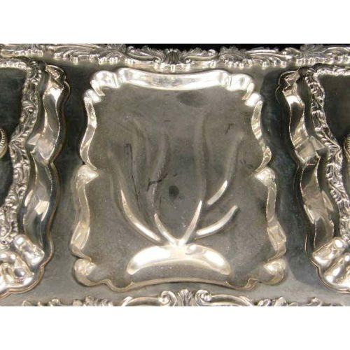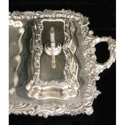 A SHEFFIELD HIGHLY ORNATE DOUBLE HANDLED THREE COMPARTMENT FOOTED TRAY<BR><BR>With covers for two compartments, heavy molded leaf border and scroll feet, 5"high over handles x 29"long over handles x 15"wide