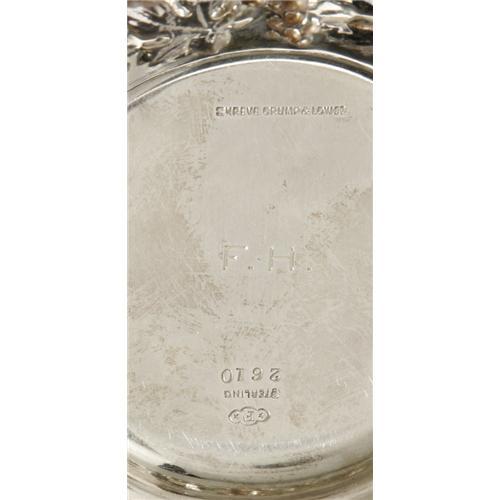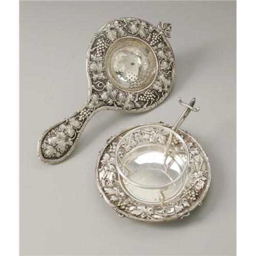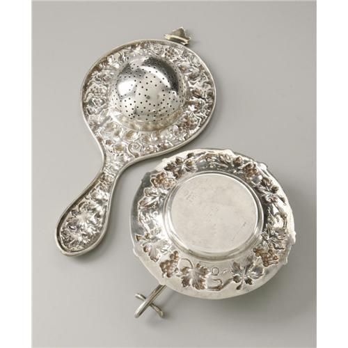<B>A Sterling Tea Strainer And Stand</B></I><BR>Ferdinand Fuchs & Bros, New York City, c.1884-1891<BR><BR>A sterling tea stainer of round hemispherical form with pierced holes, surrounded by a wide lip and handle chased with grapes, twigs and grape leaves, fitting into a matching round chased stand, retailed by Shreve, Crump & Low, Boston, maker's hallmark to underside<BR>1 Items <BR><BR><B>Condition Report:</B> Normal signs of wear with age