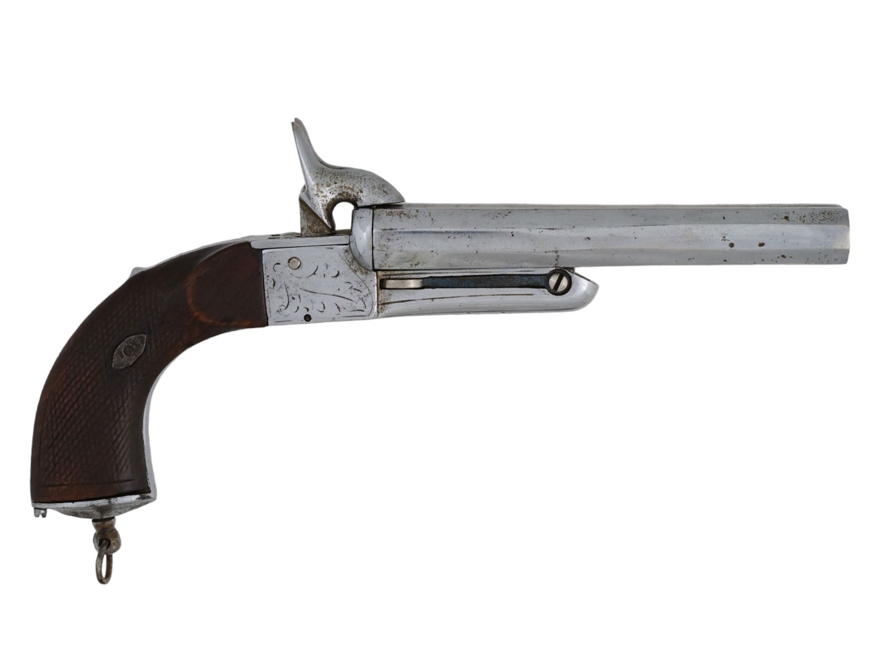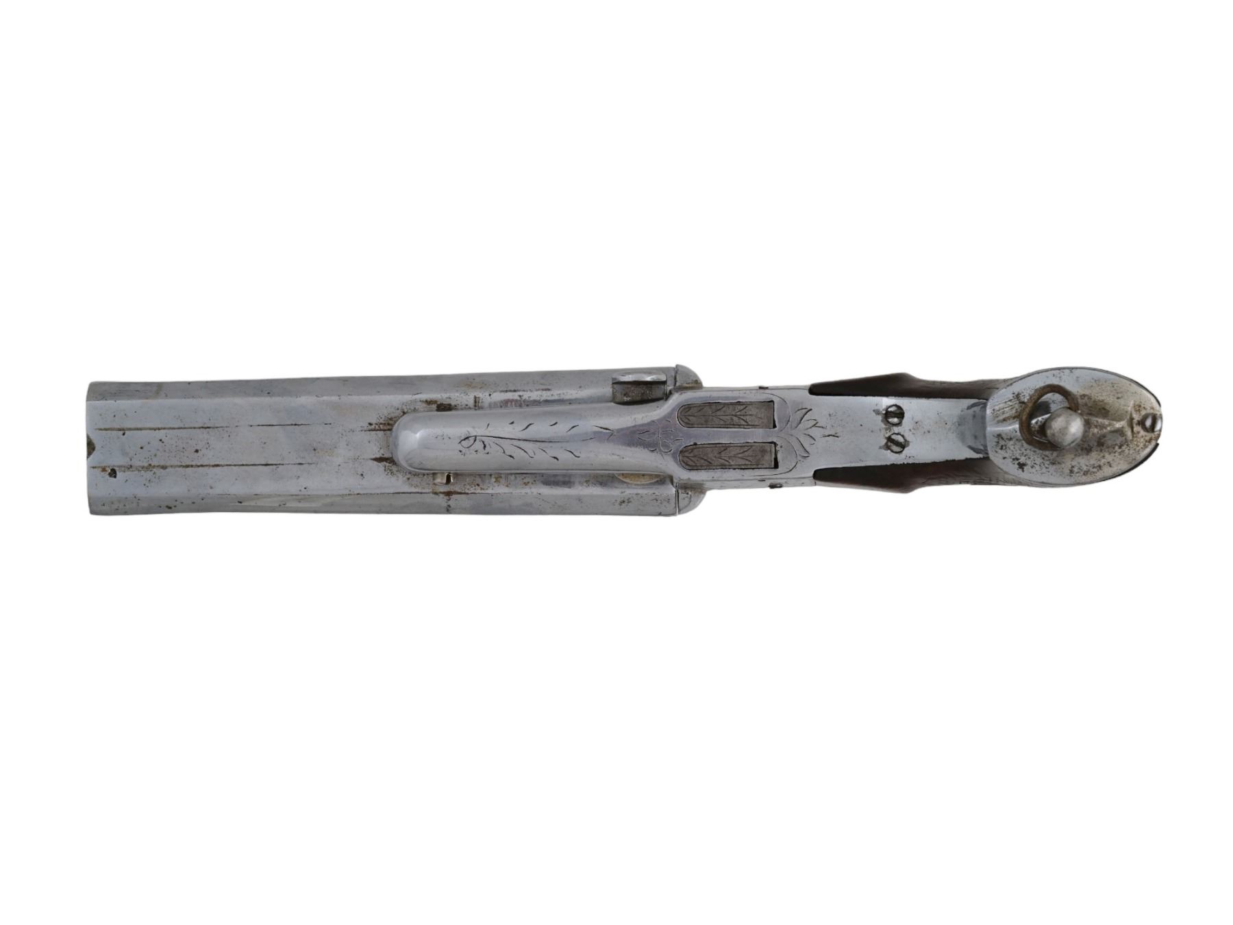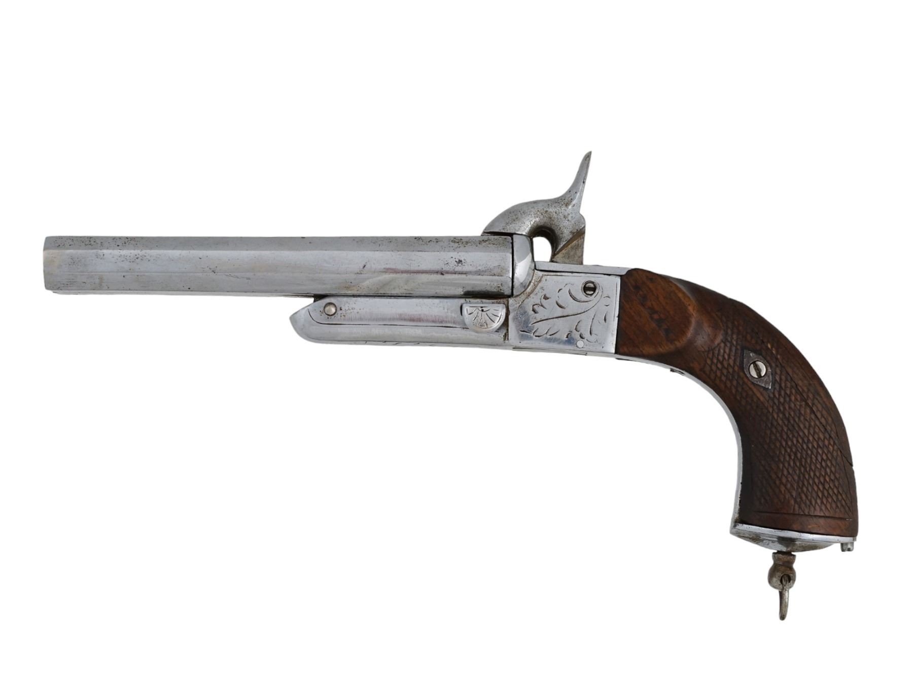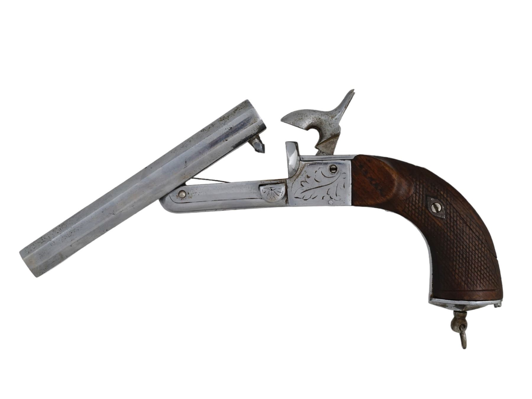 A 19th century European side-by-side pinfire 'howdah' pistol, possibly Belgian. It is a smoothbore gun with a bore diameter of 15mm. The smoothbore meant it was capable of firing either regular "ball" ammunition like that used in standard pistols, or "shot" like that used in shotguns.