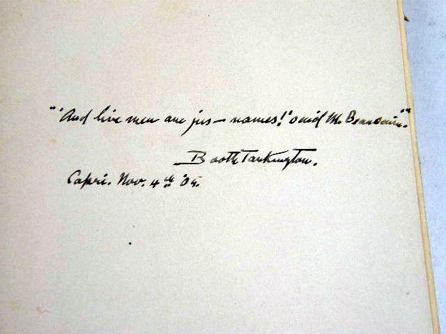 McClure, Phillips & Co., New York, 1903, with the author`s initials printed in the middle of the ornate endpapers. Inscribed on the flyleaf, "And live men are jus` - names", said M. Beaucaire/Booth Tarkington/Capri Nov. 4th `04". Newton Booth Tarkington (1869-1946) was an American novelist and dramatist best known for his Pulitzer Prize-winning novels "The Magnificent Ambersons" and "Alice Adams". "Monsieur Beaucaire" was later adapted as a play, an operetta and two films made in 1924 and 1946. Dustjacket lacking; cover with edges soiled from handling.