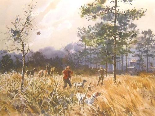 A SIGNED QUAIL HUNTING PRINT; Signed by John P. Cowan, inscribed on the back "Print purchased at Newman Galleries by ART; 6/79"
