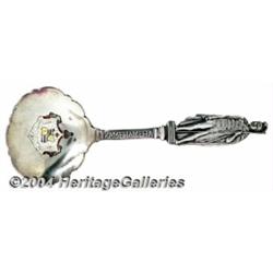 <B>A SILVER AND ENAMEL HAWAIIAN KING KAMEHAMEHA SOUVENIR SPOON</B></I><BR>Maker unknown, not marked, c.1900<BR><BR>Full figure on handle captioned "KAMEHAMEHA", large scalloped round bowl partially enameled with crest, <I>marked sterling reverse of handle</B></I><BR>5.25in. long <BR><BR><B>Important notice:</B> Heritage usually auctions material at the rate of 200-250 lots per hour. On some occasions eBay Live bid software or the Internet may not be able to keep up with the pace of the auction. We recommend placing a realistic absentee bid now as insurance to avoid disappointment. Occasionally the auctioneer may eliminate or reject an eBay Live bid, and the auctioneer may also reopen a lot after the close of the eBay live bidding (usually because we missed an audience bid), and may reject your bid even if it shows you as the winning bidder. By bidding via eBay Live, you agree that Heritage may award the lot to another bidder at its sole discretion under the circumstances described above or any other reasonable circumstances. Since eBay bids are not shown to us until we open the lot on the floor, we treat those bids just like floor bids. In most cases the floor responds before the eBay bid is presented to us, due to Internet lag time, so for consistency we have made it a policy that floor bids are always considered first over tie eBay live bids. Also please note that all Heritage lots purchased through eBay Live carry a 25% Buyer's Premium. Please make sure you read the Terms and Conditions before you bid. <BR><BR><B>IMPORTANT ANNOUNCEMENT ABOUT RESERVES:</B> Heritage now divulges all reserves on its web site 7 days before every auction. If you want to know whether the reserve on this lot has been met, and if not, what the reserve amount is, please visit this lot page on the HeritageCoin.com web site, or email: bid@HeritageGalleries.com </span></font>