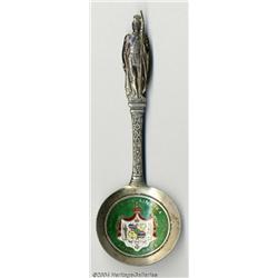 <B>A SILVER AND ENAMEL HAWAIIAN KING KAMEHAMEHA SOUVENIR SPOON</B></I><BR>Pseudo hallmarked, most likely that of Hawaiian retailer, c.1900<BR><BR>Full figure King Kamehameha handle, large round bowl with dark green enameled coat-of-arms, captioned "UA MAUKEEAOKA AINAIKA PONO. AKAHI DALA", <I>marked reverse of handle</B></I><BR>5.75in. long <BR><BR><B>Important notice:</B> Heritage usually auctions material at the rate of 200-250 lots per hour. On some occasions eBay Live bid software or the Internet may not be able to keep up with the pace of the auction. We recommend placing a realistic absentee bid now as insurance to avoid disappointment. Occasionally the auctioneer may eliminate or reject an eBay Live bid, and the auctioneer may also reopen a lot after the close of the eBay live bidding (usually because we missed an audience bid), and may reject your bid even if it shows you as the winning bidder. By bidding via eBay Live, you agree that Heritage may award the lot to another bidder at its sole discretion under the circumstances described above or any other reasonable circumstances. Since eBay bids are not shown to us until we open the lot on the floor, we treat those bids just like floor bids. In most cases the floor responds before the eBay bid is presented to us, due to Internet lag time, so for consistency we have made it a policy that floor bids are always considered first over tie eBay live bids. Also please note that all Heritage lots purchased through eBay Live carry a 25% Buyer's Premium. Please make sure you read the Terms and Conditions before you bid. <BR><BR><B>IMPORTANT ANNOUNCEMENT ABOUT RESERVES:</B> Heritage now divulges all reserves on its web site 7 days before every auction. If you want to know whether the reserve on this lot has been met, and if not, what the reserve amount is, please visit this lot page on the HeritageCoin.com web site, or email: bid@HeritageGalleries.com </span></font>