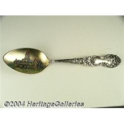 <B>A SILVER AND ENAMEL INDIANA SOUVENIR SPOON</B></I><BR>Mark of Shepard, Melrose Highlands, Massachusetts, c.1900<BR><BR>Multi-colored painted enamel bowl depicts and is captioned "Court House Evansville, Ind.", <I>marked reverse of handle</B></I><BR>5in. long <BR><BR><B>Important notice:</B> Heritage usually auctions material at the rate of 200-250 lots per hour. On some occasions eBay Live bid software or the Internet may not be able to keep up with the pace of the auction. We recommend placing a realistic absentee bid now as insurance to avoid disappointment. Occasionally the auctioneer may eliminate or reject an eBay Live bid, and the auctioneer may also reopen a lot after the close of the eBay live bidding (usually because we missed an audience bid), and may reject your bid even if it shows you as the winning bidder. By bidding via eBay Live, you agree that Heritage may award the lot to another bidder at its sole discretion under the circumstances described above or any other reasonable circumstances. Since eBay bids are not shown to us until we open the lot on the floor, we treat those bids just like floor bids. In most cases the floor responds before the eBay bid is presented to us, due to Internet lag time, so for consistency we have made it a policy that floor bids are always considered first over tie eBay live bids. Also please note that all Heritage lots purchased through eBay Live carry a 25% Buyer's Premium. Please make sure you read the Terms and Conditions before you bid. <BR><BR><B>IMPORTANT ANNOUNCEMENT ABOUT RESERVES:</B> Heritage now divulges all reserves on its web site 7 days before every auction. If you want to know whether the reserve on this lot has been met, and if not, what the reserve amount is, please visit this lot page on the HeritageCoin.com web site, or email: bid@HeritageGalleries.com </span></font>