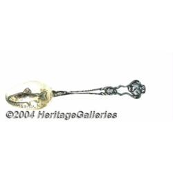 <B>A SILVER AND ENAMEL SOUVENIR SPOON</B></I><BR>Mark of Paye & Baker, North Attleboro, Massachusetts, c.1900<BR><BR>Multi-colored enameled bowl features a fish, caption "Nassau, N.P.", <I>marked reverse of handle</B></I><BR>5in. long <BR><BR><B>Important notice:</B> Heritage usually auctions material at the rate of 200-250 lots per hour. On some occasions eBay Live bid software or the Internet may not be able to keep up with the pace of the auction. We recommend placing a realistic absentee bid now as insurance to avoid disappointment. Occasionally the auctioneer may eliminate or reject an eBay Live bid, and the auctioneer may also reopen a lot after the close of the eBay live bidding (usually because we missed an audience bid), and may reject your bid even if it shows you as the winning bidder. By bidding via eBay Live, you agree that Heritage may award the lot to another bidder at its sole discretion under the circumstances described above or any other reasonable circumstances. Since eBay bids are not shown to us until we open the lot on the floor, we treat those bids just like floor bids. In most cases the floor responds before the eBay bid is presented to us, due to Internet lag time, so for consistency we have made it a policy that floor bids are always considered first over tie eBay live bids. Also please note that all Heritage lots purchased through eBay Live carry a 25% Buyer's Premium. Please make sure you read the Terms and Conditions before you bid. <BR><BR><B>IMPORTANT ANNOUNCEMENT ABOUT RESERVES:</B> Heritage now divulges all reserves on its web site 7 days before every auction. If you want to know whether the reserve on this lot has been met, and if not, what the reserve amount is, please visit this lot page on the HeritageCoin.com web site, or email: bid@HeritageGalleries.com </span></font>