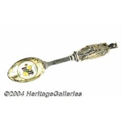 <B>A SILVER AND ENAMELED HAWAIIAN KING KAMEHAMEHA SOUVENIR SPOON</B></I><BR>Maker unknown, not marked, c.1900<BR><BR>Full figure partial-gilt King Kamehameha handle, gold washed teaspoon size bowl with enameled coat-of-arms captioned "UA MAUKEEAOKA AINAIKA PONO. HAPAHA", reverse of handle script engraved "D.R.H. San Francisco 1904", <I>marked reverse of handle</B></I><BR>5.25in. long <BR><BR><B>Important notice:</B> Heritage usually auctions material at the rate of 200-250 lots per hour. On some occasions eBay Live bid software or the Internet may not be able to keep up with the pace of the auction. We recommend placing a realistic absentee bid now as insurance to avoid disappointment. Occasionally the auctioneer may eliminate or reject an eBay Live bid, and the auctioneer may also reopen a lot after the close of the eBay live bidding (usually because we missed an audience bid), and may reject your bid even if it shows you as the winning bidder. By bidding via eBay Live, you agree that Heritage may award the lot to another bidder at its sole discretion under the circumstances described above or any other reasonable circumstances. Since eBay bids are not shown to us until we open the lot on the floor, we treat those bids just like floor bids. In most cases the floor responds before the eBay bid is presented to us, due to Internet lag time, so for consistency we have made it a policy that floor bids are always considered first over tie eBay live bids. Also please note that all Heritage lots purchased through eBay Live carry a 25% Buyer's Premium. Please make sure you read the Terms and Conditions before you bid. <BR><BR><B>IMPORTANT ANNOUNCEMENT ABOUT RESERVES:</B> Heritage now divulges all reserves on its web site 7 days before every auction. If you want to know whether the reserve on this lot has been met, and if not, what the reserve amount is, please visit this lot page on the HeritageCoin.com web site, or email: bid@HeritageGalleries.com </span></font>