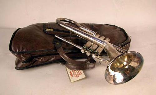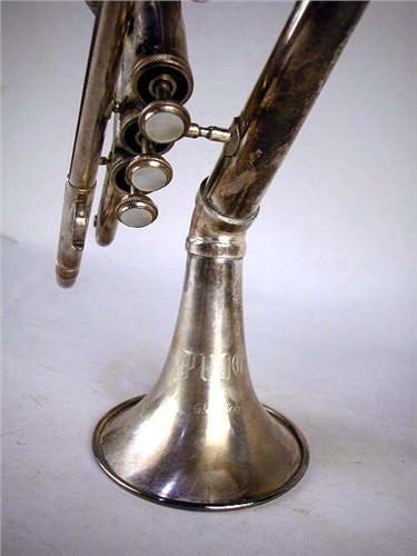 A SILVER AND MOTHER-OF-PEARL INLAID PUDGY TRUMPET Inscribed "Pudgy by Denicola", Registry #177637, d