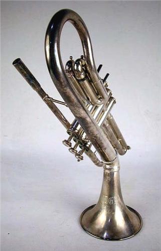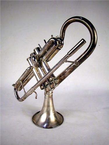 A SILVER AND MOTHER-OF-PEARL INLAID PUDGY TRUMPET Inscribed "Pudgy by Denicola", Registry #177637, designed by Bob DeNicola, Mencer Music, Trenton, NJ (Lacks mouthpiece)