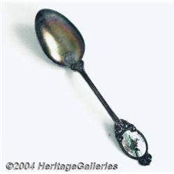 <B>A SILVER ENAMEL BOWL SALEM WITCH SOUVENIR SPOON</B></I><BR>Mark of Shepard, Melrose Highlands, Massachusetts, c.1900<BR><BR>Multi-colored enameled handle features a witch and black cat riding on a broom in the moonlight, bowl undecorated, <I>marked reverse of handle</B></I><BR>5.5in. long <BR><BR><B>Important notice:</B> Heritage usually auctions material at the rate of 200-250 lots per hour. On some occasions eBay Live bid software or the Internet may not be able to keep up with the pace of the auction. We recommend placing a realistic absentee bid now as insurance to avoid disappointment. Occasionally the auctioneer may eliminate or reject an eBay Live bid, and the auctioneer may also reopen a lot after the close of the eBay live bidding (usually because we missed an audience bid), and may reject your bid even if it shows you as the winning bidder. By bidding via eBay Live, you agree that Heritage may award the lot to another bidder at its sole discretion under the circumstances described above or any other reasonable circumstances. Since eBay bids are not shown to us until we open the lot on the floor, we treat those bids just like floor bids. In most cases the floor responds before the eBay bid is presented to us, due to Internet lag time, so for consistency we have made it a policy that floor bids are always considered first over tie eBay live bids. Also please note that all Heritage lots purchased through eBay Live carry a 25% Buyer's Premium. Please make sure you read the Terms and Conditions before you bid. <BR><BR><B>IMPORTANT ANNOUNCEMENT ABOUT RESERVES:</B> Heritage now divulges all reserves on its web site 7 days before every auction. If you want to know whether the reserve on this lot has been met, and if not, what the reserve amount is, please visit this lot page on the HeritageCoin.com web site, or email: bid@HeritageGalleries.com </span></font>