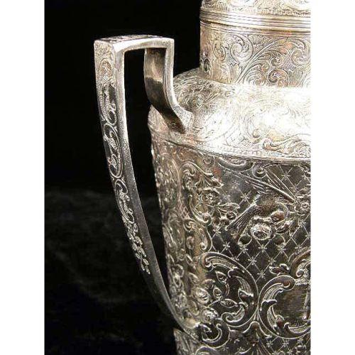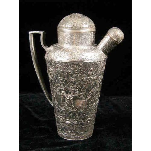 A SILVER ON COPPER COCKTAIL SHAKEER<BR><BR>Over-all engraved and chased scroll, leaf and floral decoration, 8-1/2"high