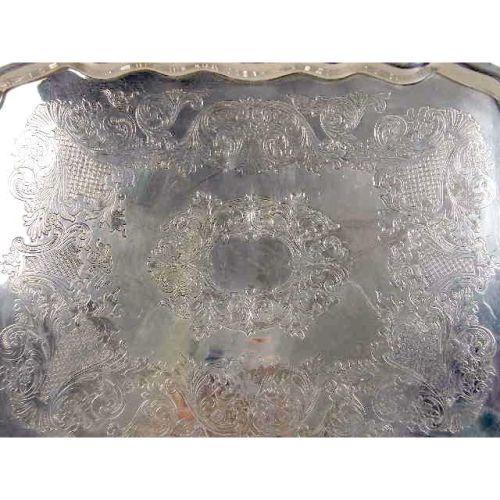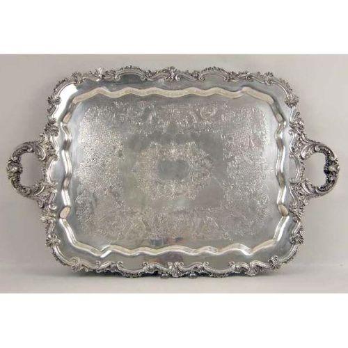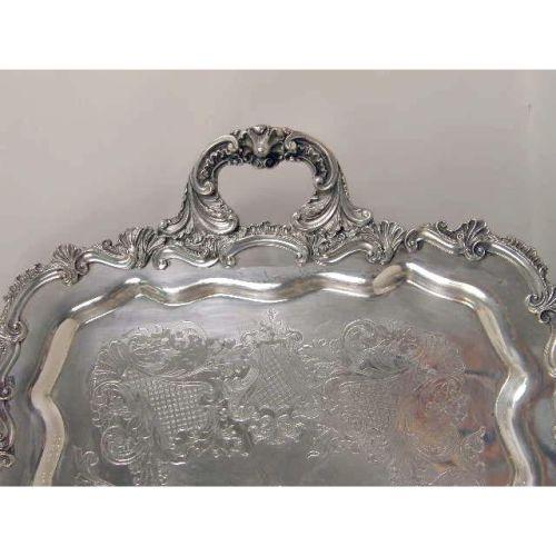 A SILVER ON COPPER DOUBLE HANDLED FOOTED RECTANGULAR TEA TRAY<BR><BR>With applied shell and scroll motif border, 26-1/2"long ove handles