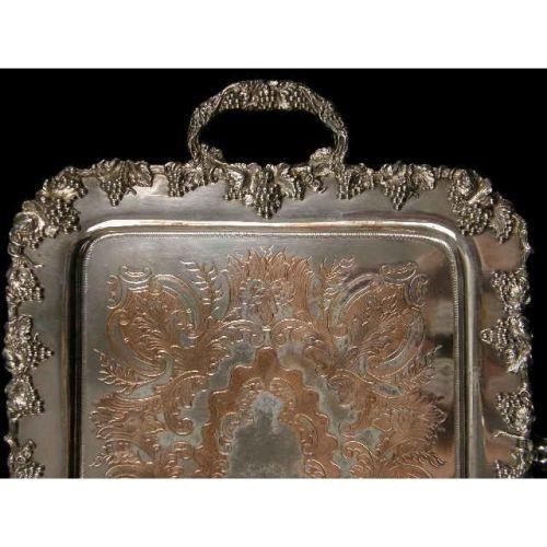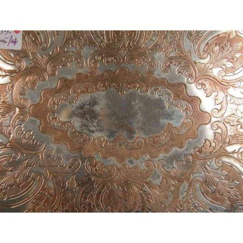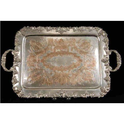 A SILVER ON COPPER DOUBLE HANDLED TRAY<BR><BR>With grape and leaf motif, 19-3/4"long, worn