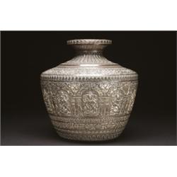 A SILVER ON COPPER URN, the ovoid body with nearly square shoulders rising to a cupped mouth, with a band of eleven deities under masks and avial figures, enclosed by multiple flower and leaf borders, the shoulder with a band of avial