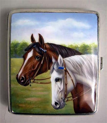 A SILVER PLATED HORSE MOTIF ENAMEL CIGARETTE CASE; 3-1/4" X 2-7/8", some slight scratches to enamel