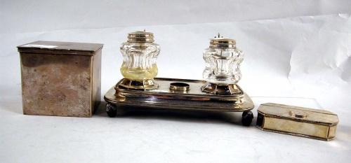 A SILVER PLATED INKSTAND WITH TWO GLASS INK POTS; Together with a group of silver plated hinged boxes